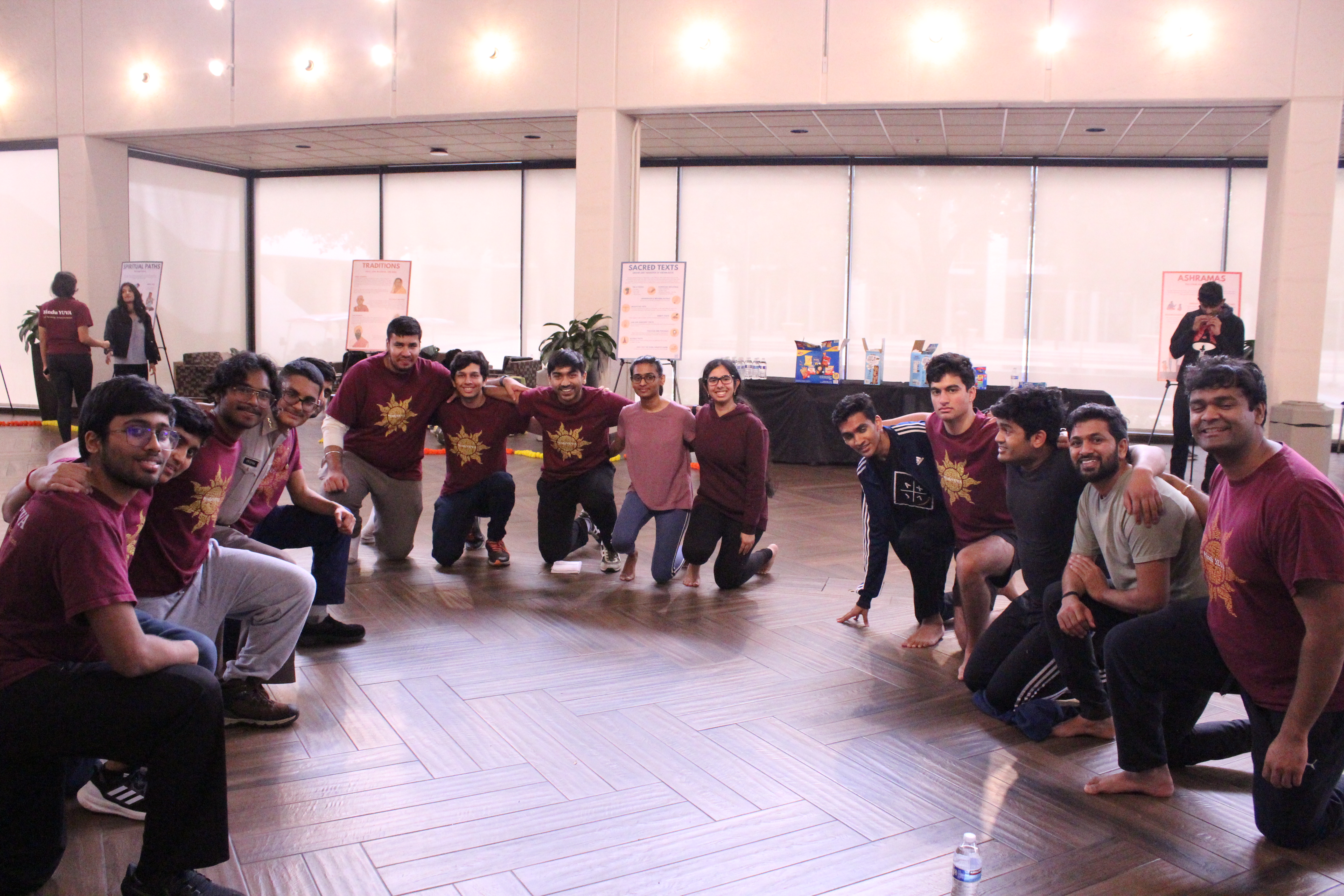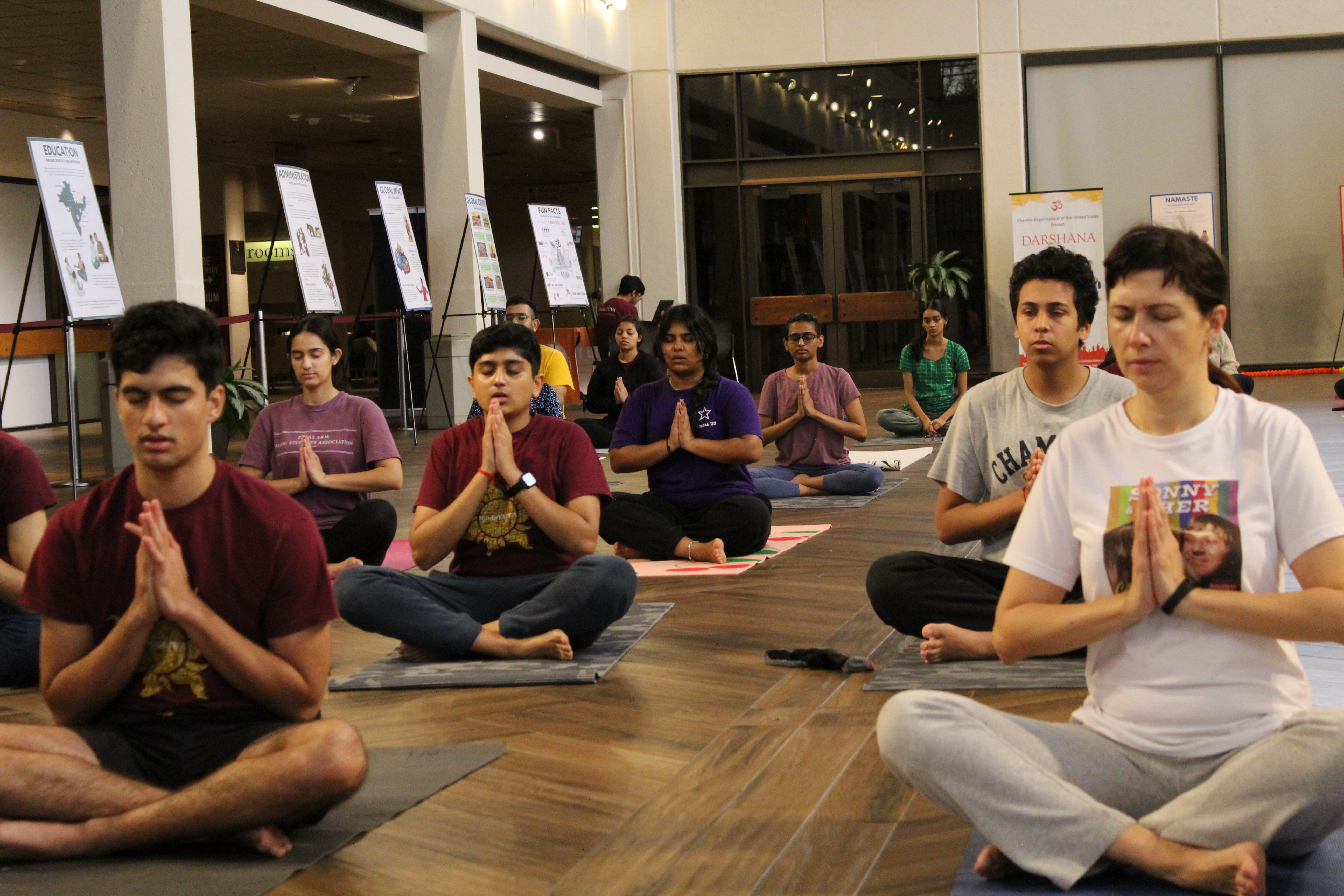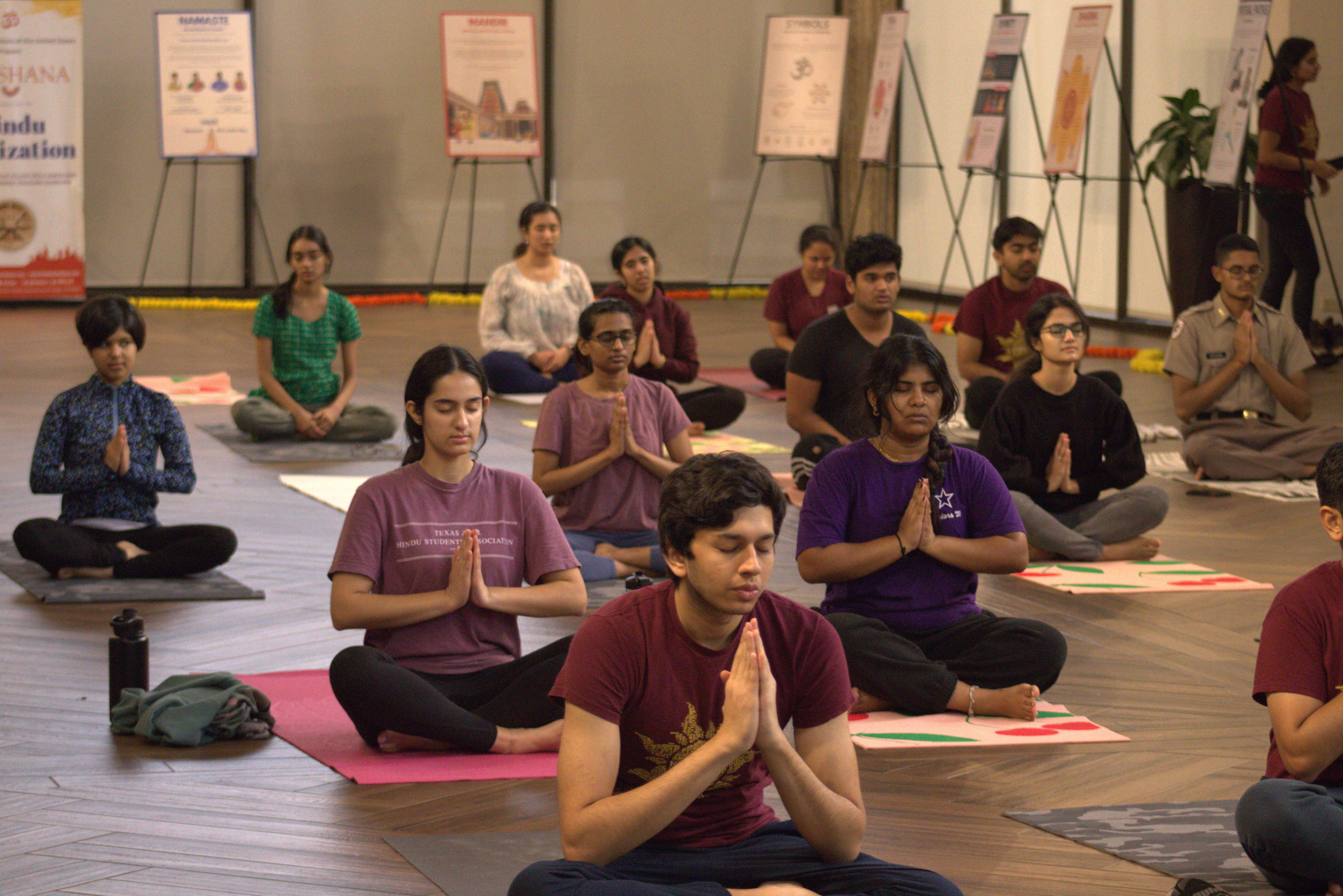 Students embraced the revitalizing energy of the sun at Texas A&M University as Hindu YUVA hosted Surya Namaskar Yagna, a holistic yoga practice of sun salutations to rejuvenate the mind, body, and spirit. Around 30 people shared this sacred yogic experience in the Exhibit Hall of the A&M Rudder Theatre, as well as participated in fun games and viewed beautiful Darshana exhibits featuring a variety of different topics in Hindu culture.