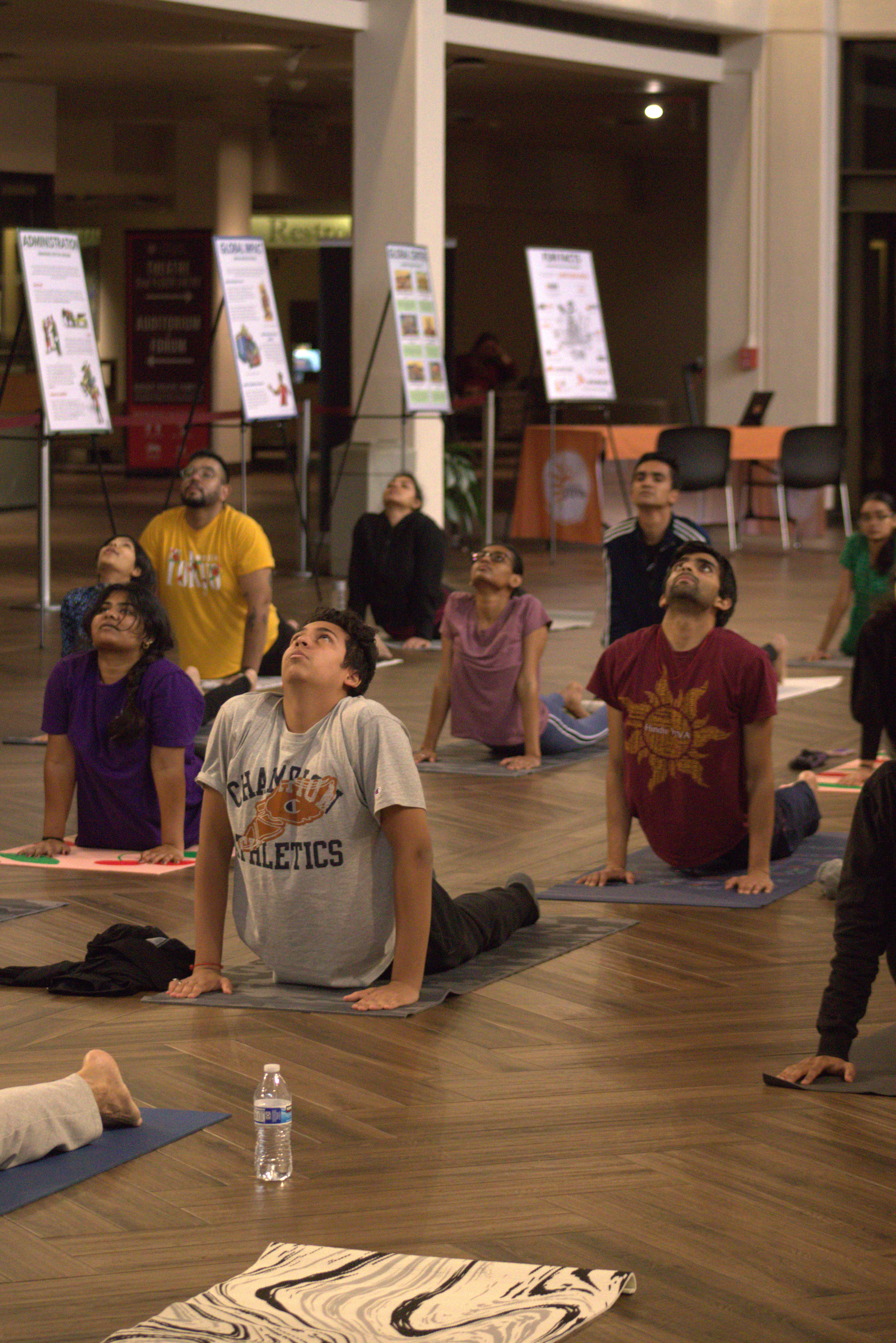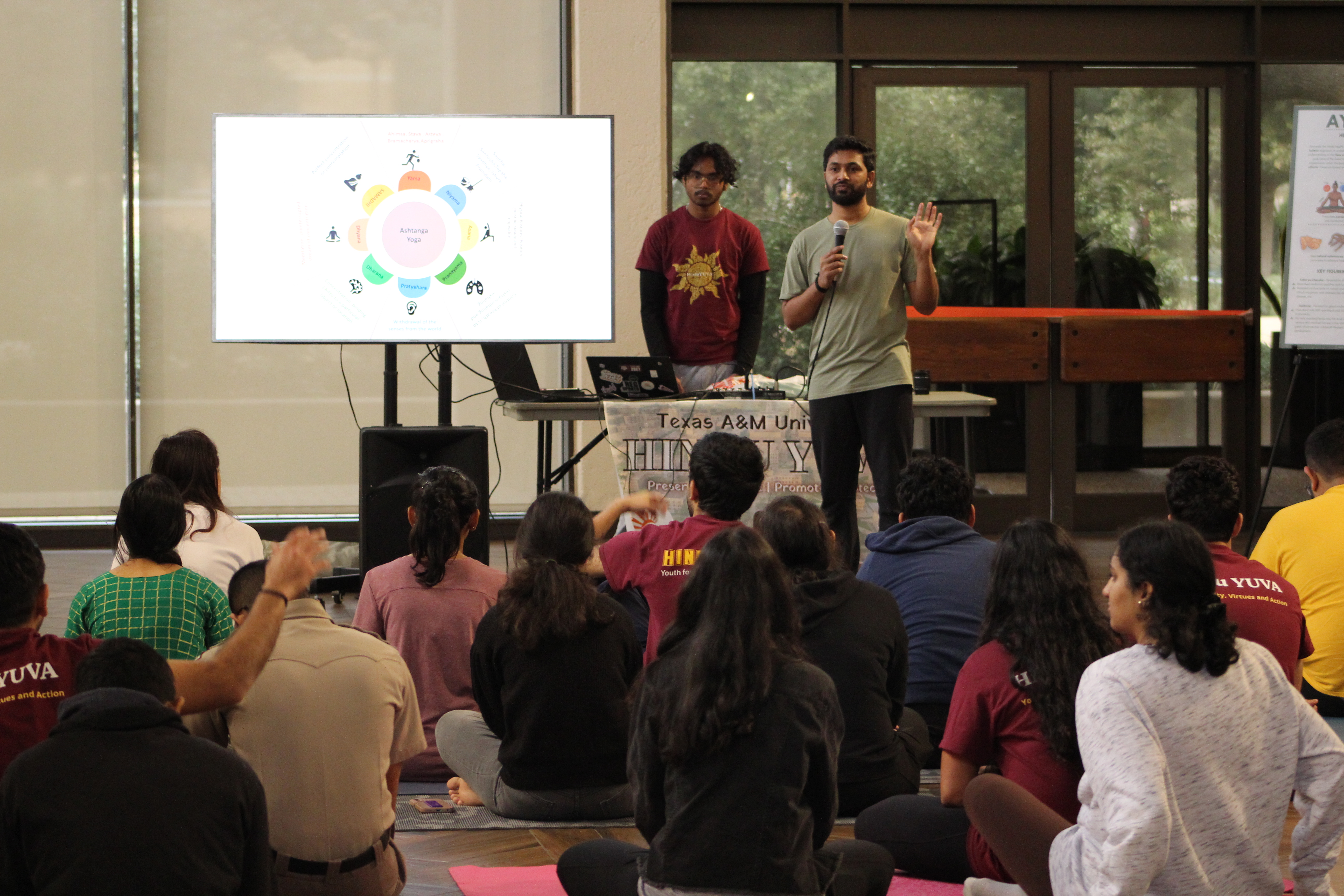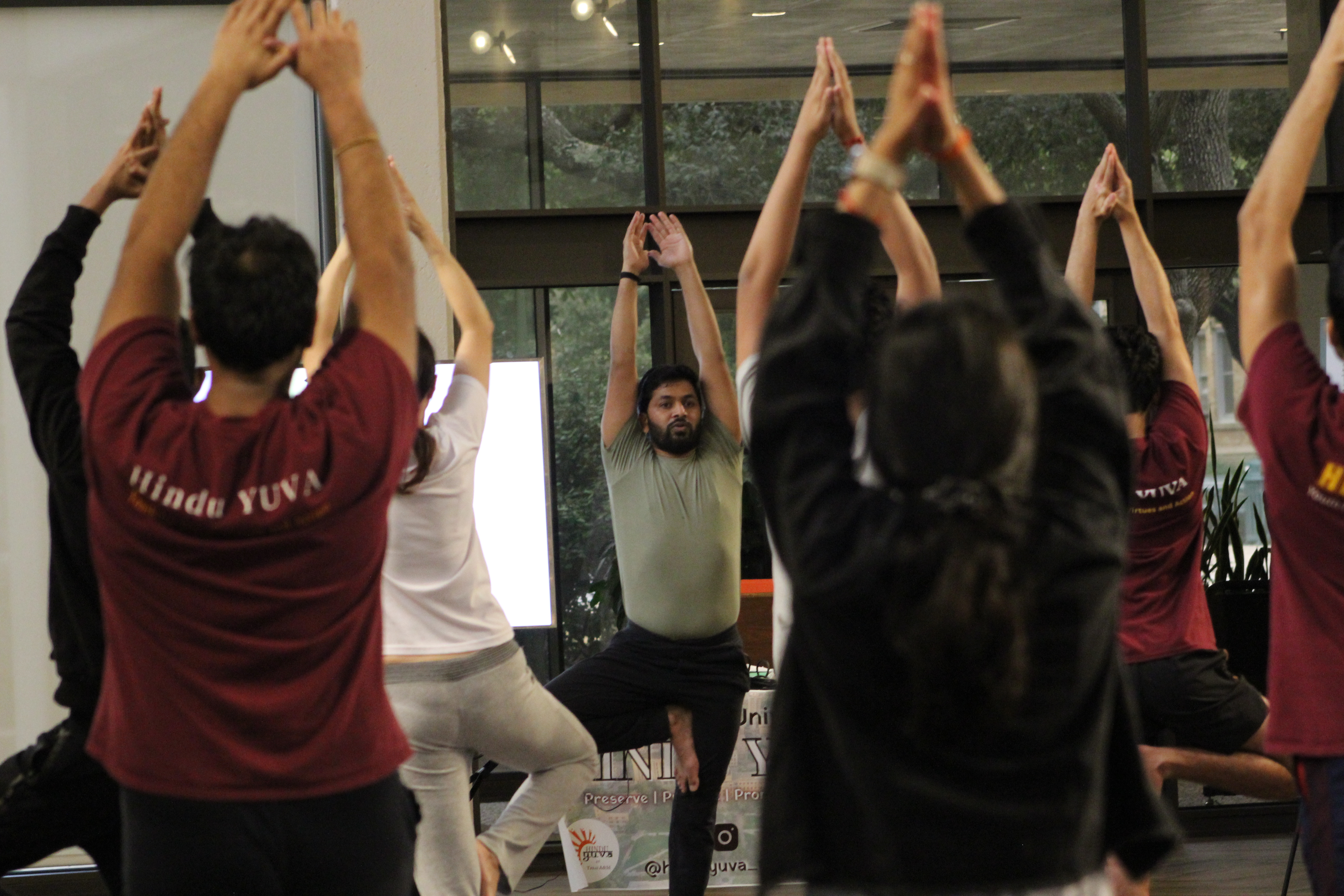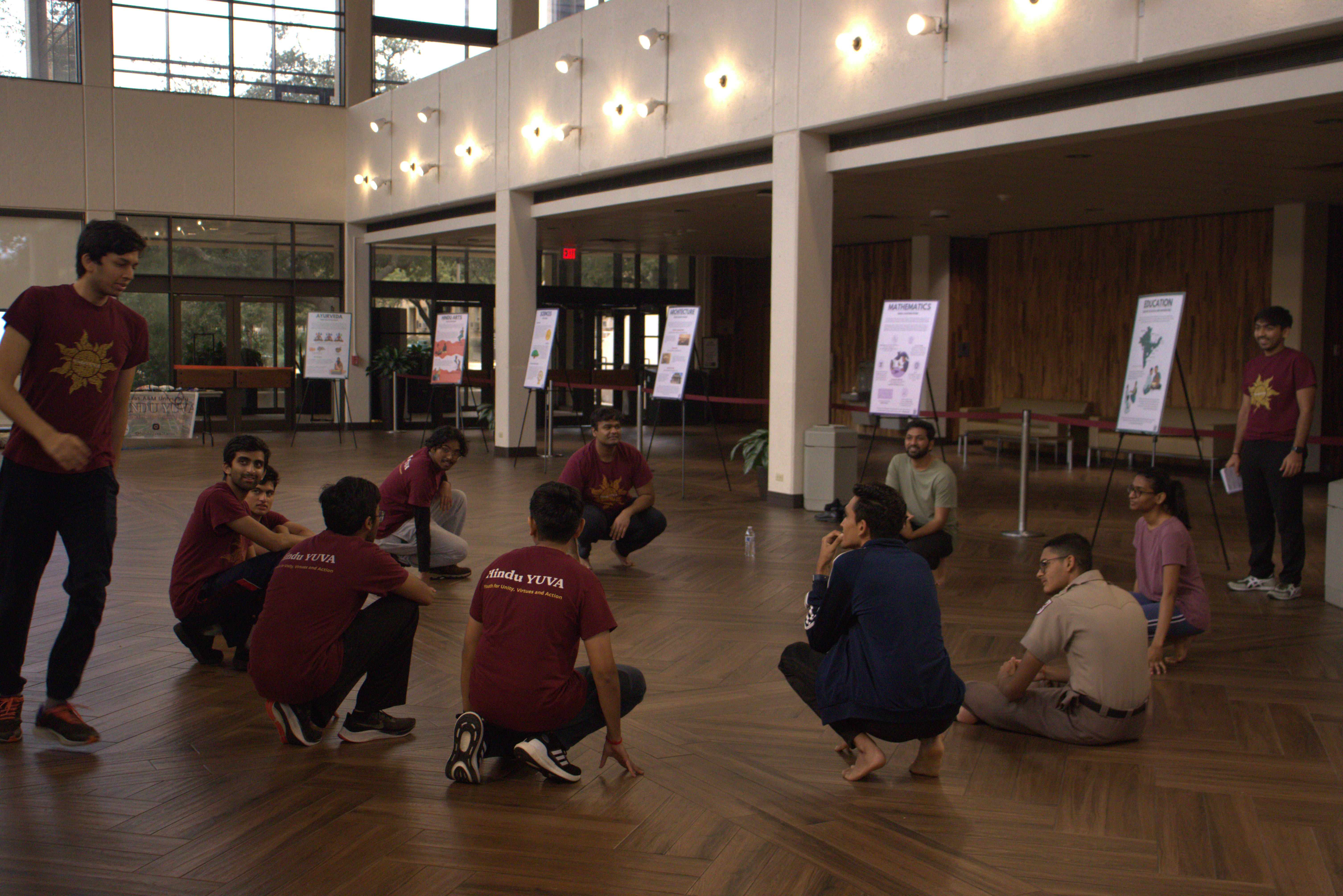 Students embraced the revitalizing energy of the sun at Texas A&M University as Hindu YUVA hosted Surya Namaskar Yagna, a holistic yoga practice of sun salutations to rejuvenate the mind, body, and spirit. Around 30 people shared this sacred yogic experience in the Exhibit Hall of the A&M Rudder Theatre, as well as participated in fun games and viewed beautiful Darshana exhibits featuring a variety of different topics in Hindu culture.